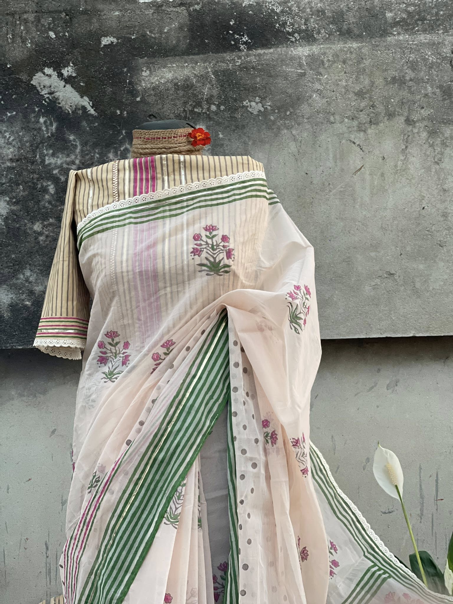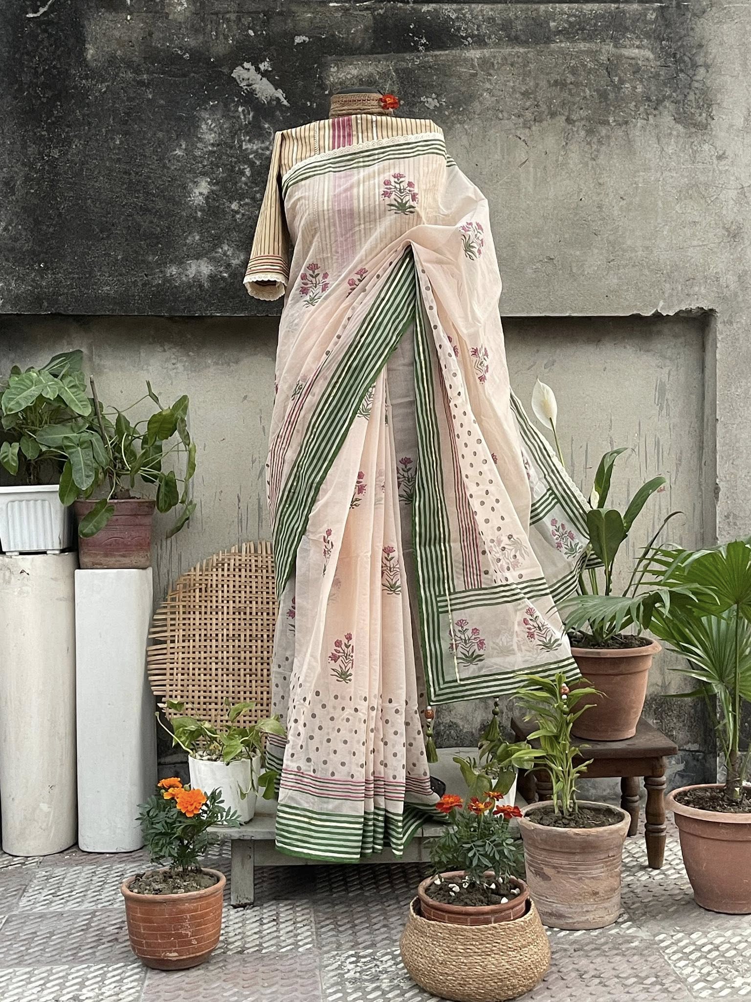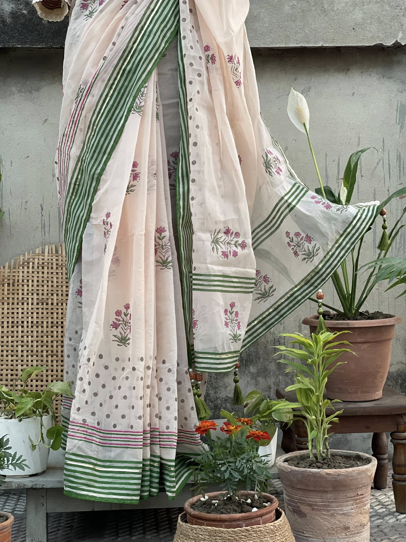 Classic old-school wooden block prints on luxurious Tangail half-silk fabric, refreshed with contemporary flair. Adorned with subtle ribbon borders, delicate crochet lace, retro-inspired stripes, and charming ball motifs. Features elegant saree falls & tassel work for a polished finish. Comes with a matching cotton blouse piece. A perfect fusion of heritage artistry and modern elegance โ ideal for festive wear, parties, and special occasions!